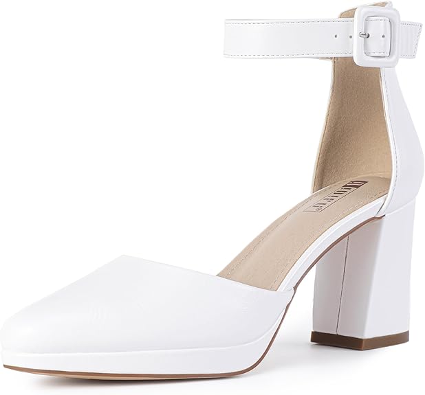 IDIFU IN3 Women's Pumps Closed Toe Heels Platform Chunky Block Heels Dress Shoes for Women Dressy Wedding Bridal Prom Shoes Pointed Toe Ankle Strap Low Heels Comfortable Short Thick Heels