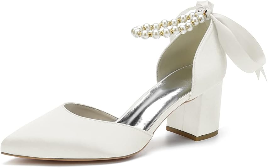 Women's Pointed Toe Pearl Wedding Shoes for Bride Low Heels Satin Heels with Bow Bridal Shoes Chunky Block Heels Comfortable Dance Shoes Pumps