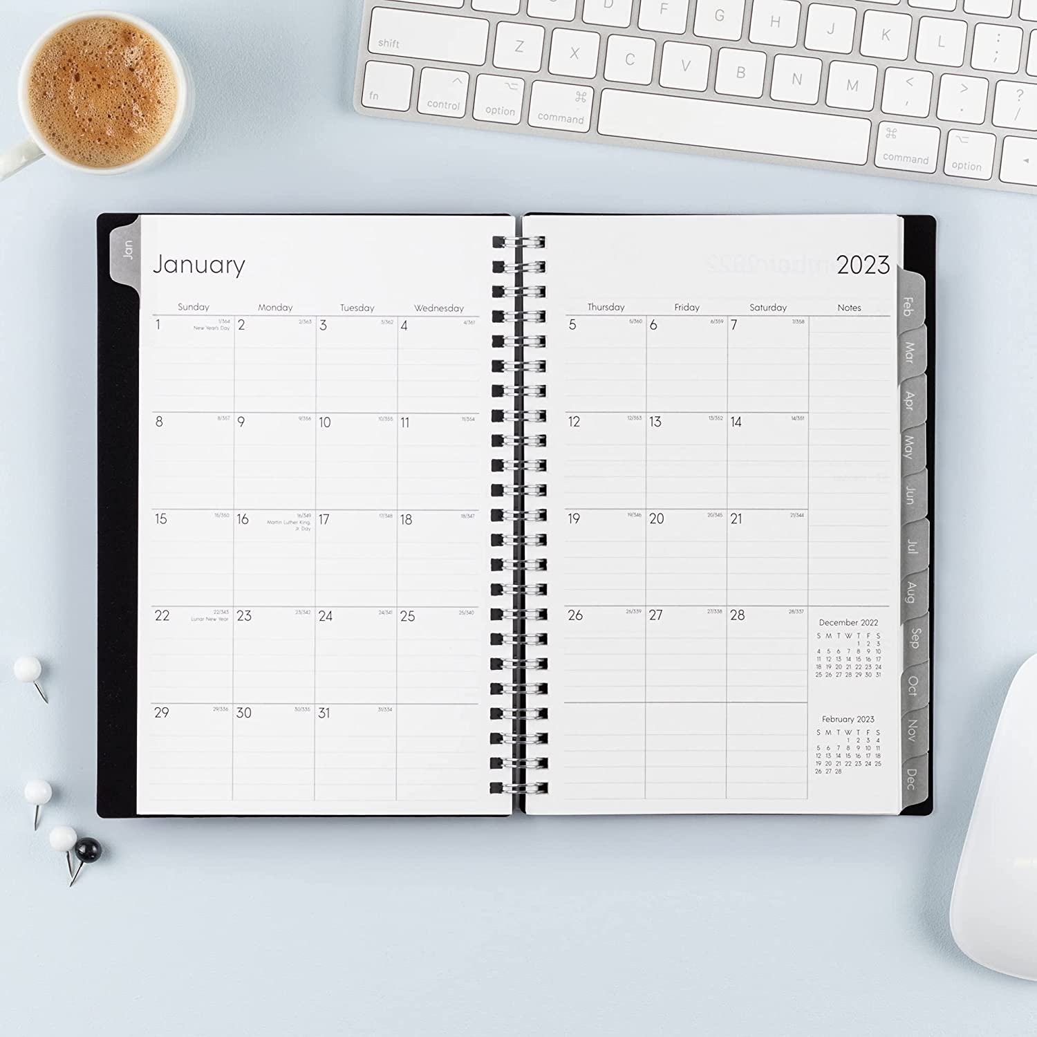 • January 2023 - December 2023 stylish day planner with 12 months of monthly and weekly pages for easy year-round planning; 6 additional monthly pages (July 2022 - December 2022) are included