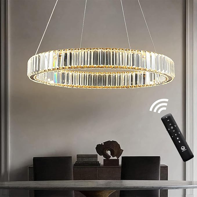 Gold Crystal Chandeliers Dimmable LED Chandelier with Remote Control, 20in Ring Pendant Lighting Adjustable Hanging Ceiling Light Modern Chandelier for Dining Room Kitchen Living Room Bedroom