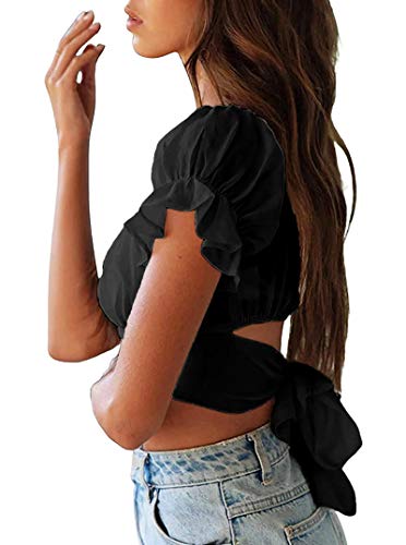 Avanova Women's Ruffle Short Sleeve Off Shoulder Tie Up Back Crop Blouse Top Black Small