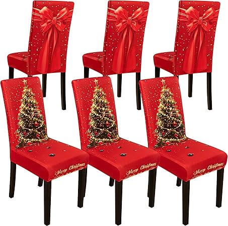 6PCS Christmas Dining Chair Covers Stretch Removable Washable Dining Room Chair Protector Slipcover 3D Print Xmas Tree Bow Tie Kitchen Chair Cover Slipcovers for Xmas Holiday Party Home Dê©cor