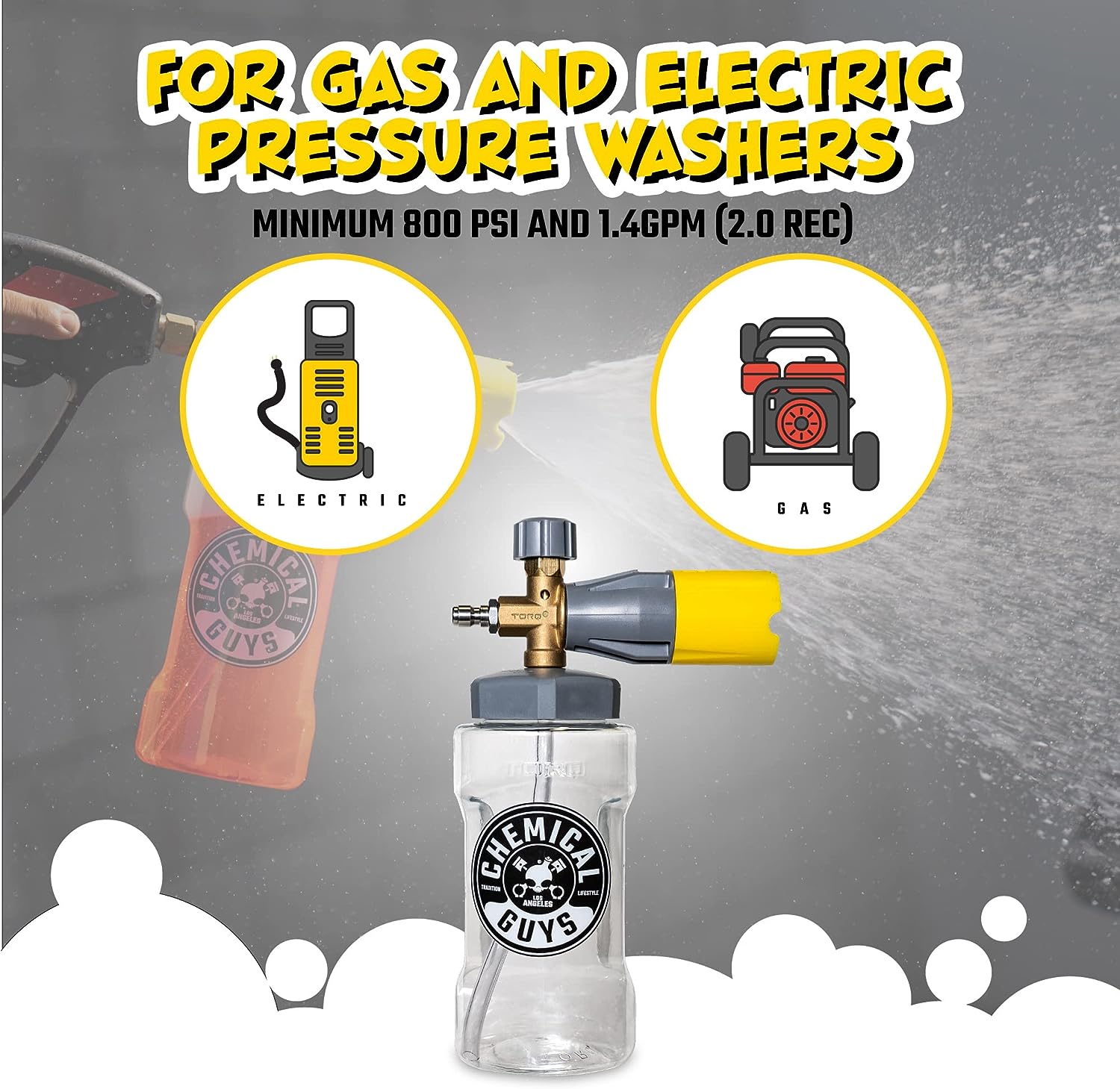 • Shoots thick suds with as little as 800 PSI and 1.4 GPM (2.0 recommended)