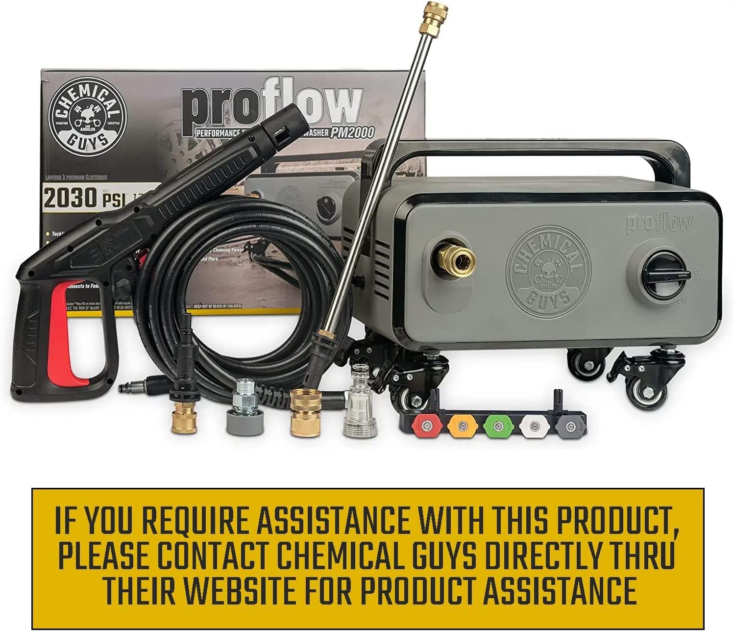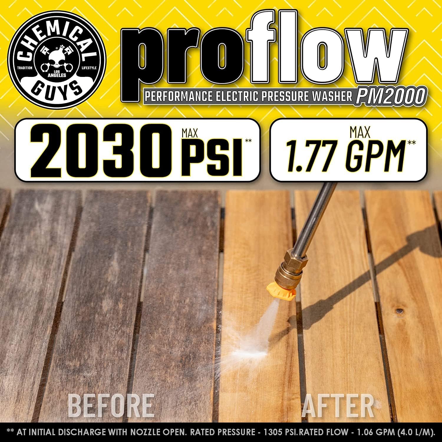 Upgrade to the all new Chemical Guys ProFlow Performance Electric Pressure Washer PM2000! Tackle the toughest jobs quickly and easily with power and precision. The ProFlow has a powerful 14.5 Amp/1680W-Motor with up to 2030 PSI of pressure** and up to 1.77 GPM**; which means you have all the muscle you need in a compact and lightweight machine to tackle the dirtiest jobs! The ProFlow comes with 5 quick connect spray nozzles that feature a variety of stream angles for versatile cleaning power. The extra-long 35' power cord and four 360 degree rolling casters are ideal for rapid cleaning around your home, garage, car, truck, boat, RV and more. Grab the ProFlow by the comfortable and ergonomic handle and carry the lightweight yet powerful machine everywhere dirt demands. Grab your favorite Chemical Guys car wash soap, attach your Chemical Guys Foam Cannon and use the extra-long 20' flex hose, extended, or compact barrel pressure washer gun attachments and throw the ultimate foam party! Trust us, you'll have a blast cleaning your ride in tons of foamy fun!