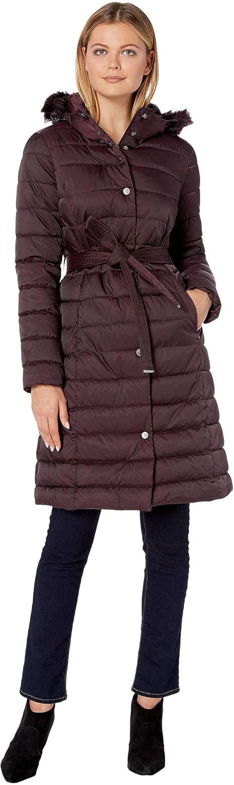 Kenneth Cole Women's Belted Snap Front Puffer with Faux Fur Trimmed Hood