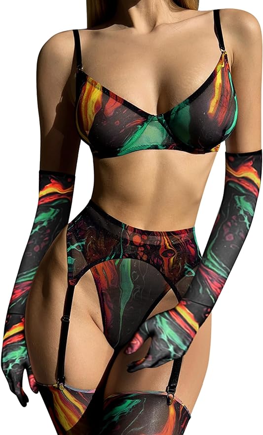 popiv Women Sexy Garter Lingerie Set Festival Rave Outfits Marble Print Tie Dye Lingerie Matching Bra Sets 5pc