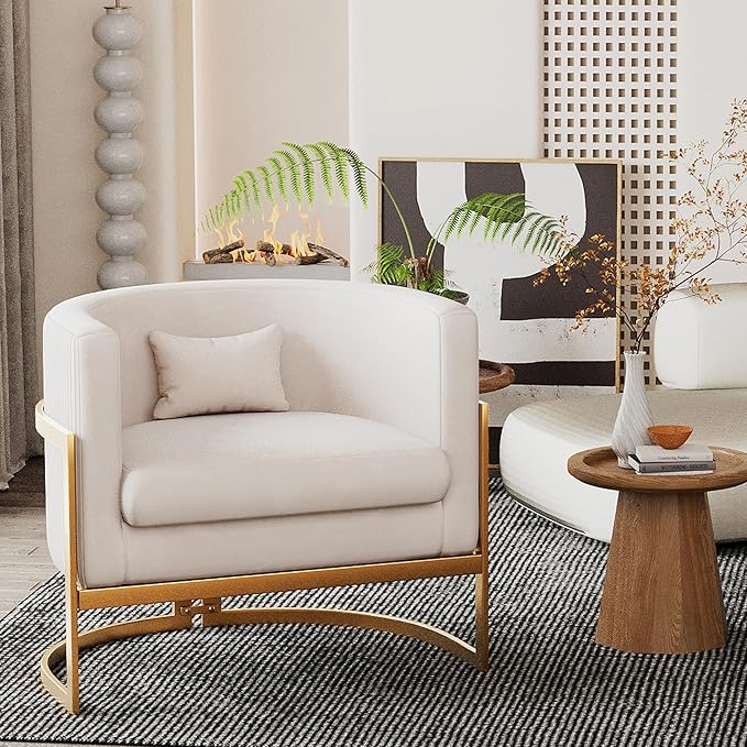 Alunaune Upholstered Velvet Accent Chair Barrel Chairs Modern Living Room Armchair, Mid Century Lounge Chairs Sofa Tub Bucket Club Chair for Bedroom-Ivory