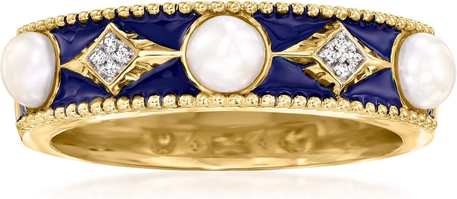 Ross-Simons 3.5-4mm Cultured Button Pearl Ring With Blue Enamel and Diamond Accents in 18kt Gold Over Sterling