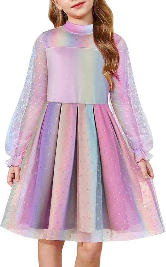 Arshiner Girls Dresses Contrast Mesh Puff Long Sleeve Mock Neck Formal Party A Line Short Tulle Dress