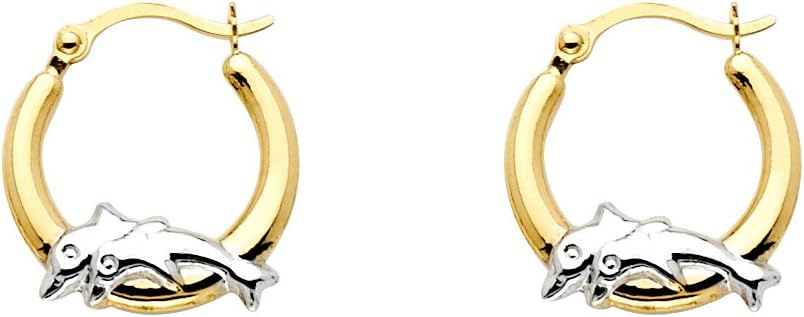 14k Two Tone Gold Fancy Dolphin Hoop Earrings (13mm Diameter)