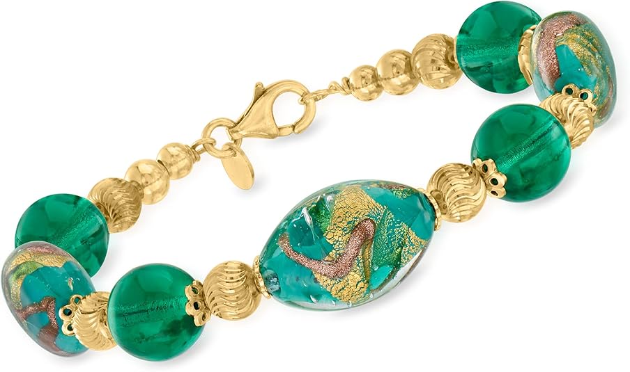 Ross-Simons Italian Green and Goldtone Murano Glass Bead Bracelet in 18kt Gold Over Sterling. 7 inches