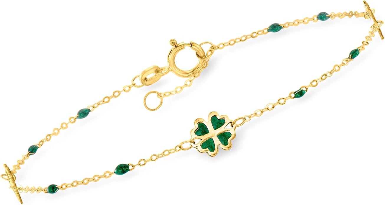 Ross-Simons Italian Green Enamel Clover Station Bracelet in 14kt Yellow Gold. 6.5 inches