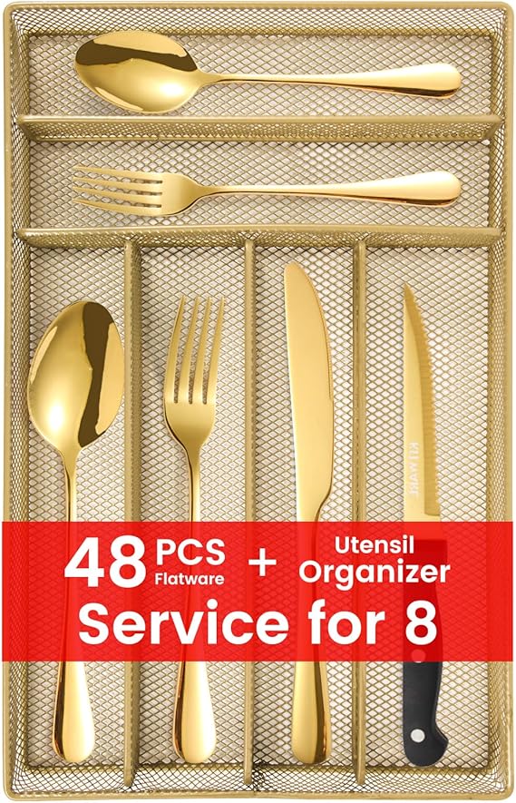 48 pcs Gold Silverware Set with Organizer, Stainless Steel Flatware with Steak Knife for 8, KITWARE Utensil Cutlery with Metal Tray, Home Kitchen Knife Fork Spoon, Mirror Polished