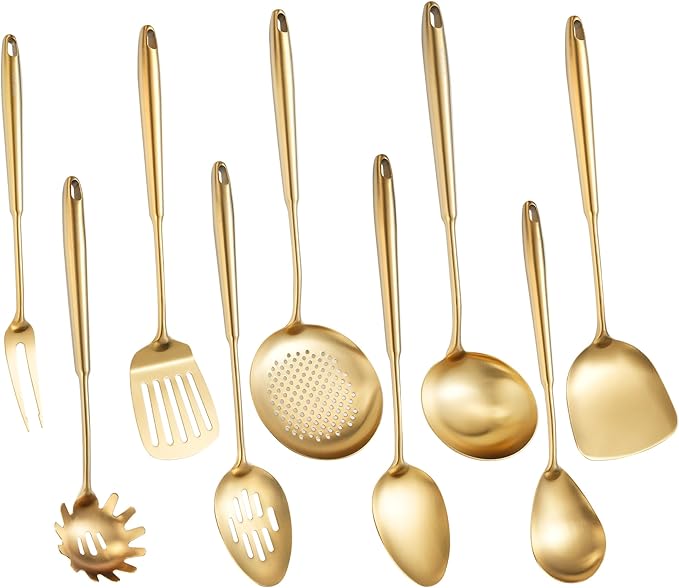 Gold Kitchen Utensils Set, 9 PCS 304 Stainless Steel All Metal Cooking Tools with Solid Spoon, Slotted Spoon, Fork, Spatula, Ladle, Skimmer, Slotted Tunner, Spaghetti Spoon, Large Spoon