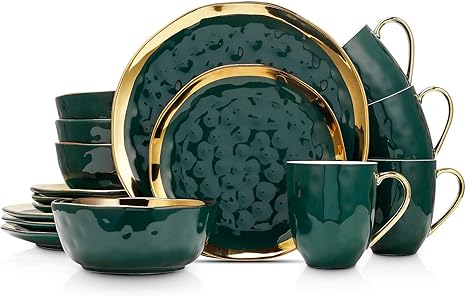 Stone Lain Porcelain 16 Piece Dinnerware Set, Service for 4, Green and Golden Rim