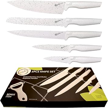 Stainless Steel Cooking Knives Set - White Kitchen Utility, Chef, Bread, Slicing, & Paring Knife Set with Vegetable Ceramic Peeler - Rust Proof, Sharp Knives for Kitchen - O-Yaki