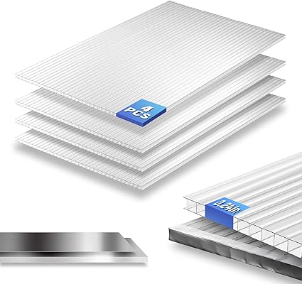 4 Pcs Polycarbonate Greenhouse Panels, 4' x 2' x 0.24'' Thickness Twin Wall Polycarbonate Sheets with 24pcs Waterproof Aluminum Foil Tape, Clear UV Polycarbonate Panels for Outdoor and Plant Stand Roof