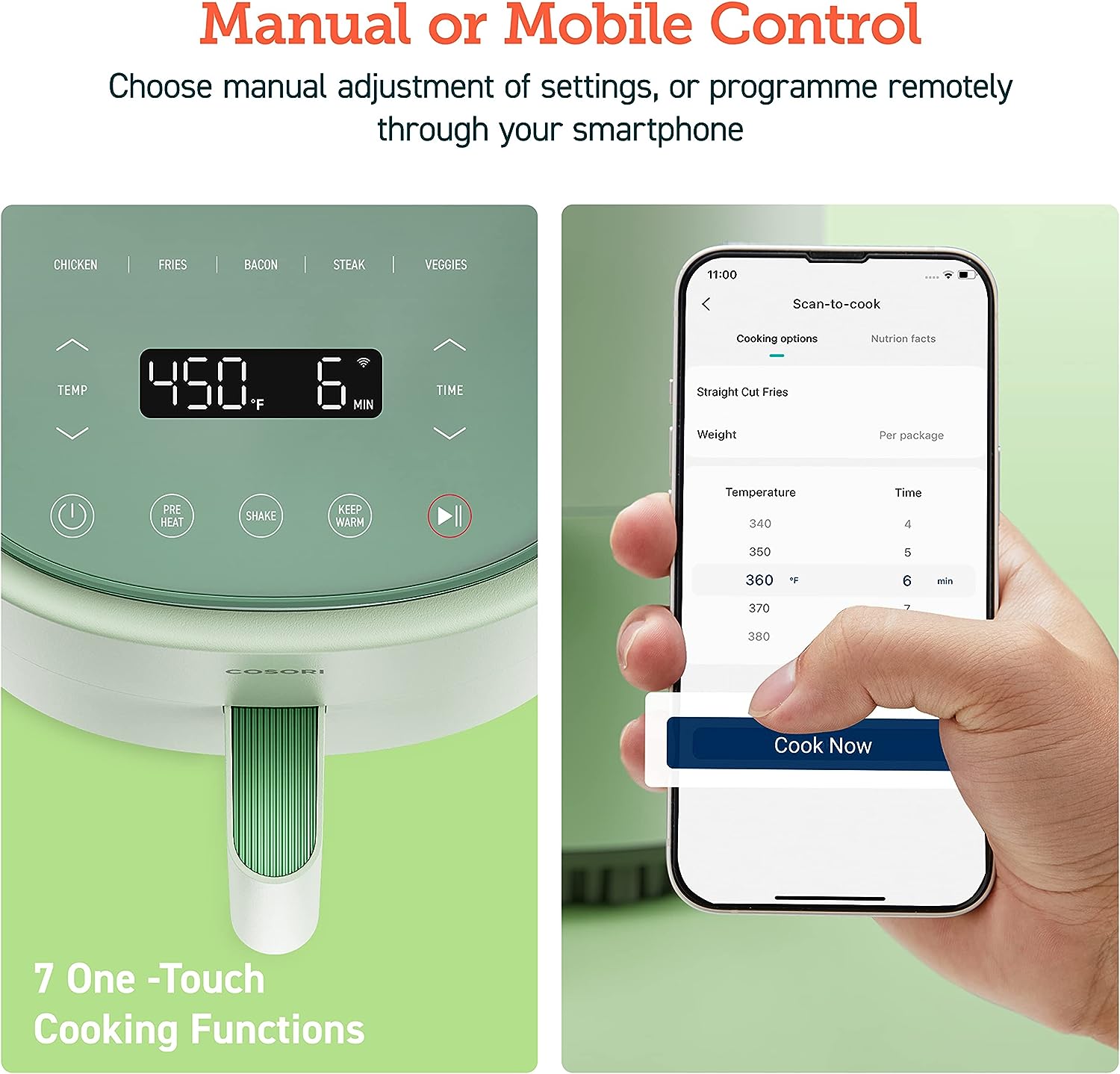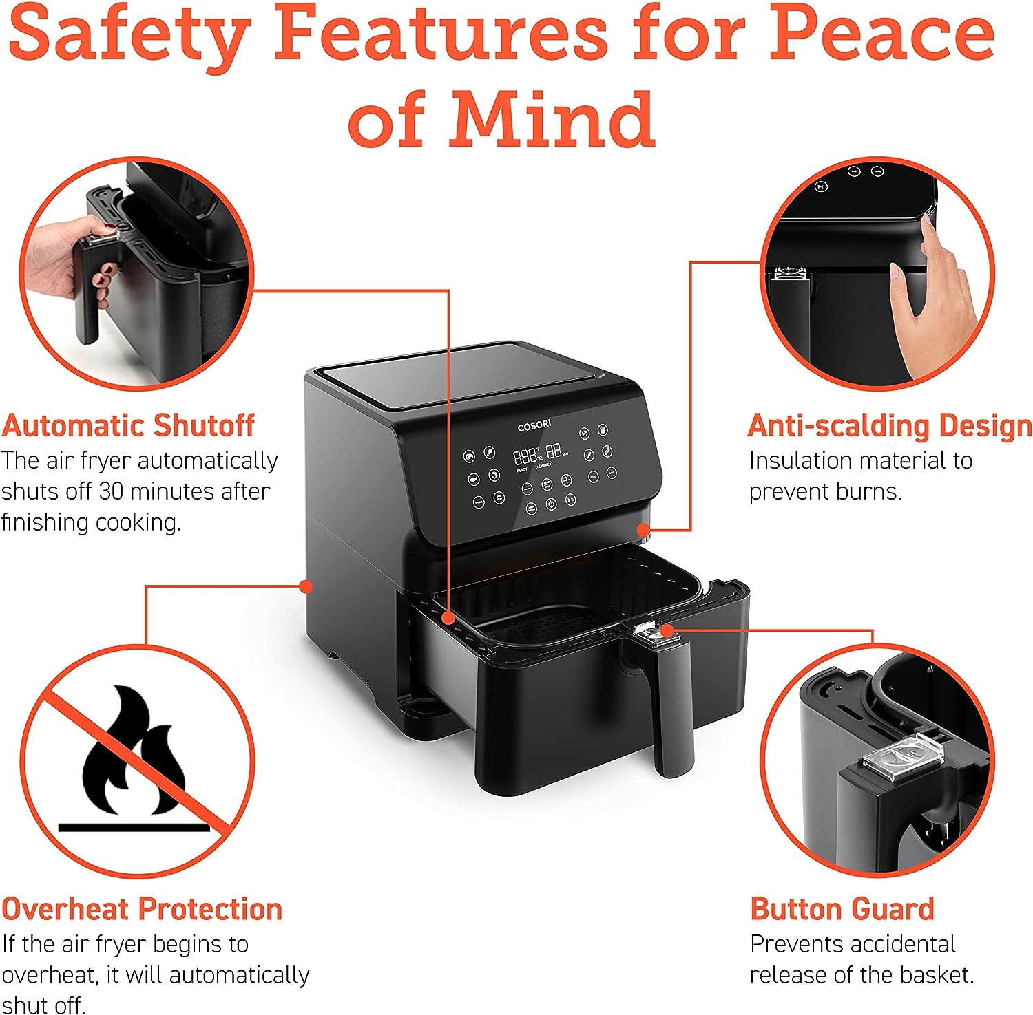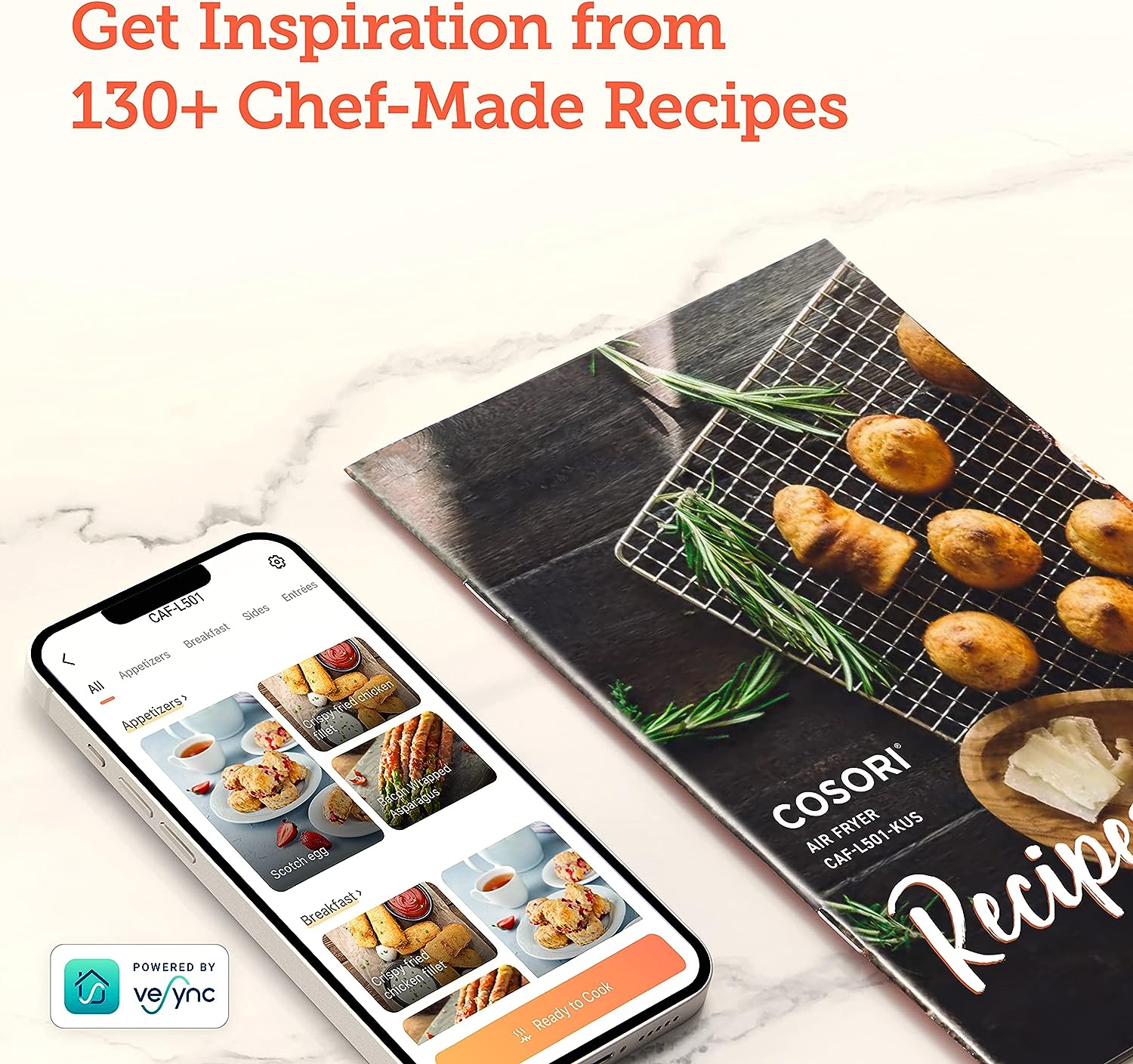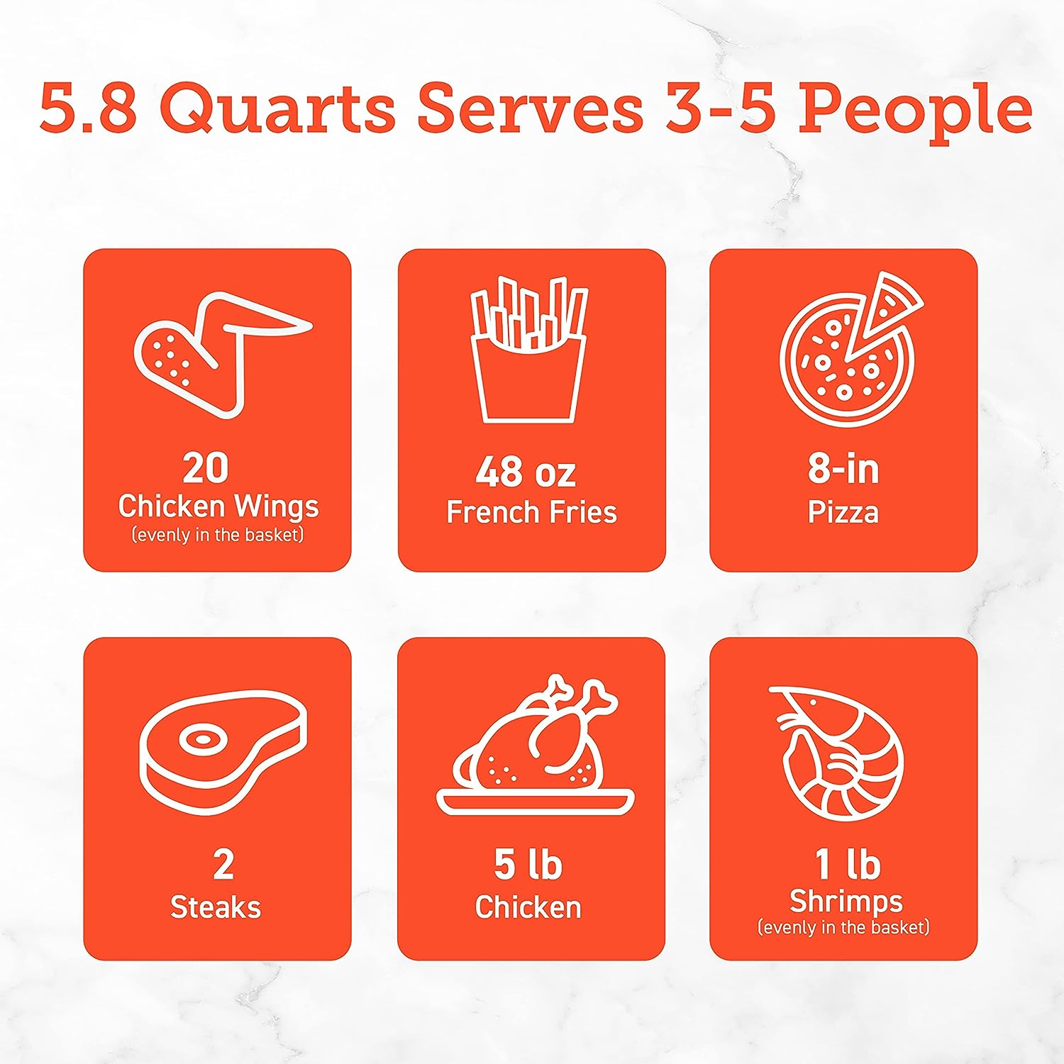 • COSORI COOKBOOK INCLUDED: Be inspired by delicious, chef-created recipes and browse 100 options in the recipe book, SERVES 3–5 PEOPLE: The square 5.8-quart baskets can fit a whole 5 lb chicken, perfect for family dinners