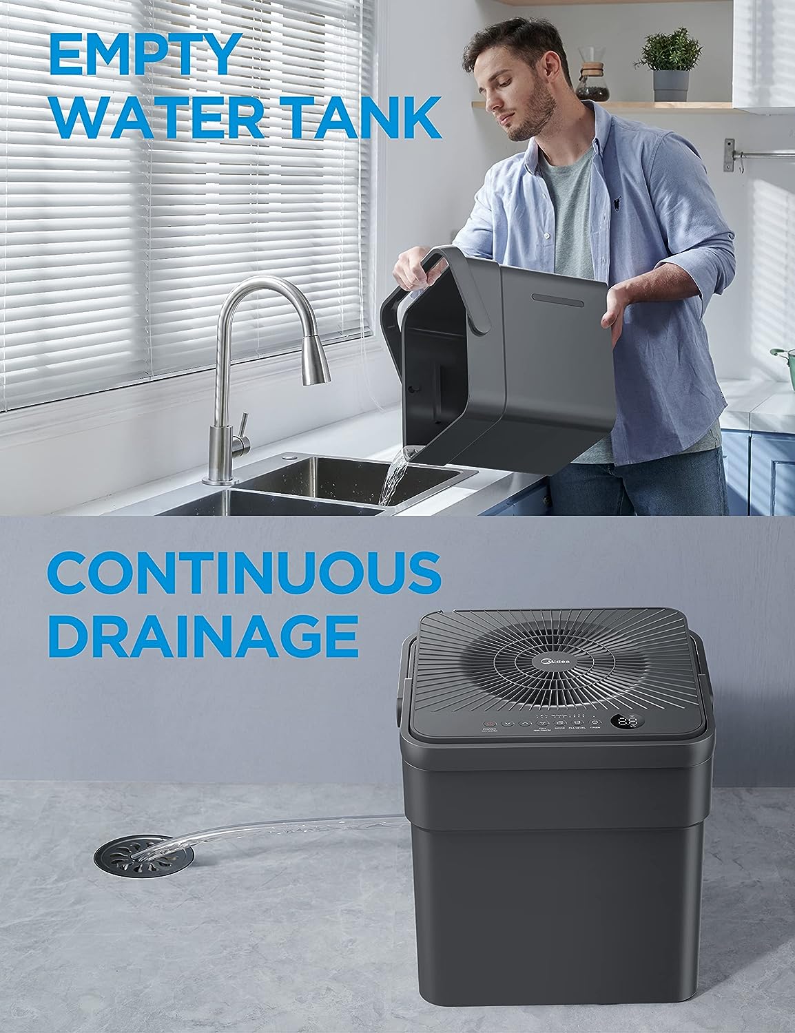 • CONTINUOUS DRAIN OPTION - Versatile, no-bucket option provides more flexibility to remove moisture. You can remove the water tank and place the unit above the sink using the included drain hose, or position it over a floor drain, near a window or door