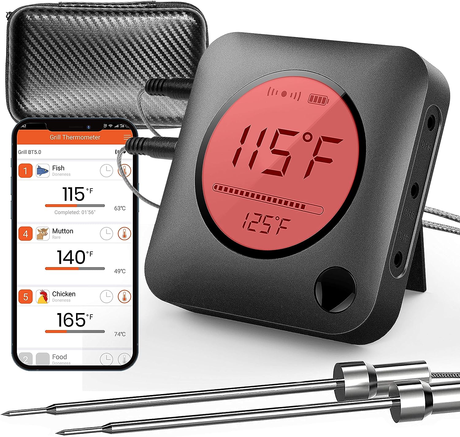 • ADJUSTABLE TEMPERATURE MONITORING: The bluetooth thermometer lets you monitor temperature & get alerts for your favorite dishes. Allows you to set temperature alerts and check cook status using the mobile application. Great for steak, chicken & more