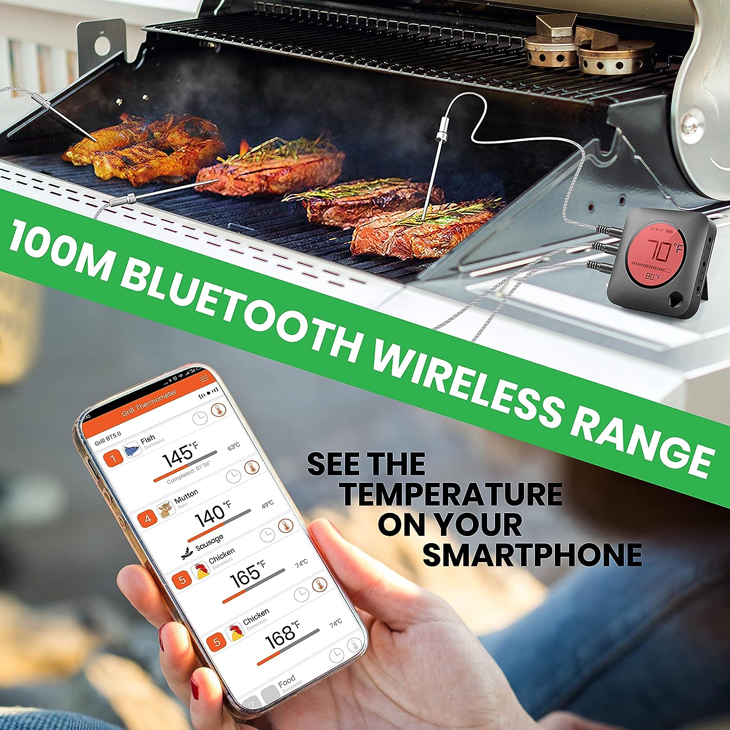 • ADD UP TO 6 PROBES: The Smart Bluetooth BBQ Grill Thermometer allows you to add up to 6 probes for accurate & reliable temp readouts. Safely leave probes inside any oven or grill for the entire cook duration. Can withstand temperatures of up to 572°F