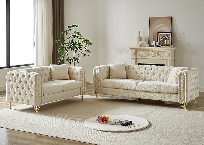 2 Pieces Chenille Living Room Furniture Sofa Couch Set, Button Tufted Comfy Couch with Nailhead Trim&Metal Legs, Mid Century Modern Couch and Loveseat Sets for Living Room(Loveseat+3 Seater Sofa, Beige)