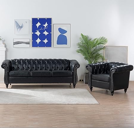 84" Leather Chesterfield Sofas and Chair for Living Room Furniture Sets, Chair and Sofa 2 Pieces for Office Apartment Easy to Assemble (Black)