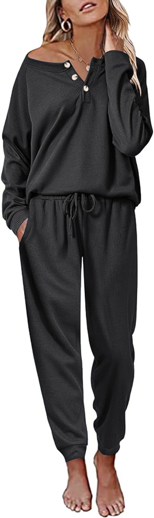 Andeip Womens Pajama Set Waffle Knit Lounge Set 2 Piece Long Sleeve Top and Pants Loungewear Pj Sets