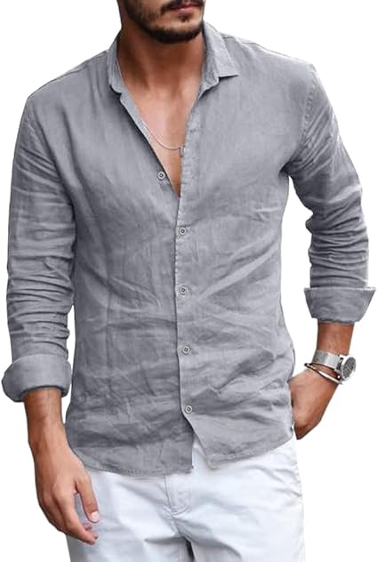 Mens Button Down Shirt Linen Cotton Shirts Casual Long Sleeve Spread Collar Lightweight Beach Plain Tops