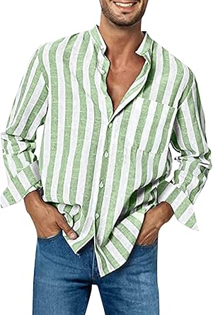 Men's Casual Stylish Cotton Striped Long Sleeve Linen Shirts Band Collar Button Down Dress Shirt with Pocket