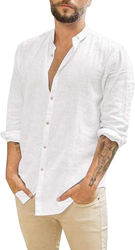 Mens Cotton Linen Shirts Long Sleeve Casual Buttons Down Solid Plain Roll-Up Sleeve Summer Beach Shirts
