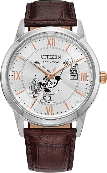 Citizen Eco-Drive Disney Steamboat Willie Mickey Mouse Stainless Steel Case Watch, Brown Leather Strap (Model: AW1788-07W)