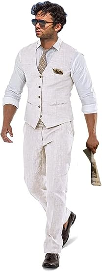 Linen Beach Wedding Suits Men's Slim Fit 2 Piece Groom Suit Prom Party Dress Tuxedos Vest Pants Suit Set