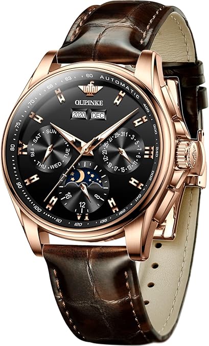 OLEVS Dress Watches for Men Brown/Black Leather Strap Automatic Self Winding Wrist Watch with Waterproof Moon Phase Sapphire Crystal Diamond Dial