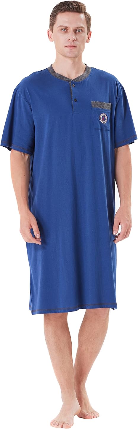 Keyocean Men Nightshirt, 100% Cotton Soft Comfy Short Sleeves Crew Neck Sleeping Loungewear