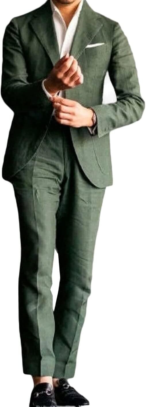 Mens Green Linen Notch Lapel Blazer Pants Slim Fit Two Button Casual Groom Prom Tuxedo 2 Pieces Suit Set