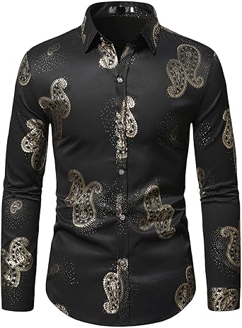 Mens Hipster Gold Paisley Printed Slim Fit Long Sleeve Dress Shirts Casual Button Down Shirt Formal Party Wedding Prom Shirts