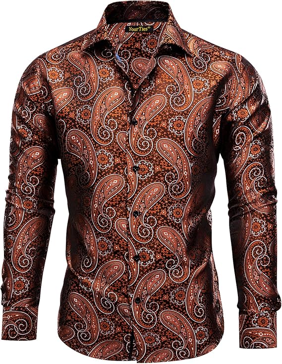 Mens Paisley Dress Shirts Regular Fit Casual Button Down Shirt Long Sleeve Silk Western Floral Shirt Wedding Party