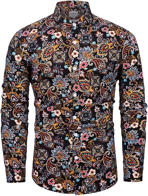 TUNEVUSE Men Floral Dress Shirts Long Sleeve Casual Button Down Flower Printed Shirts 100% Cotton