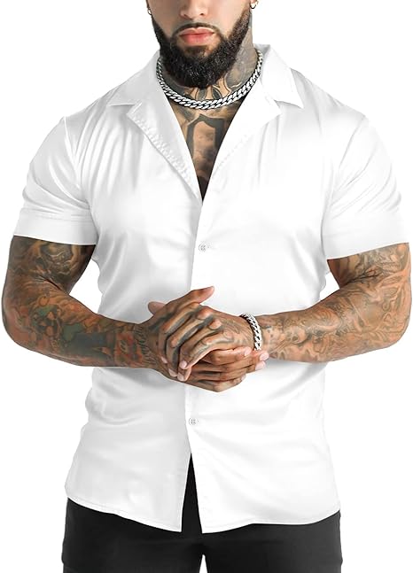 URRU Men's Luxury Shiny Silk Like Satin Dress Shirt Cuban Collar Short Sleeve Casual Slim Fit Muscle Button Up Shirts