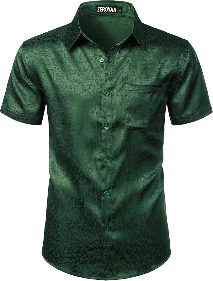 ZEROYAA Men's Shiny Luxury Silk Satin Jacquard Dress Shirt Short Sleeve Button Up Shirts with Pocket for Party Prom