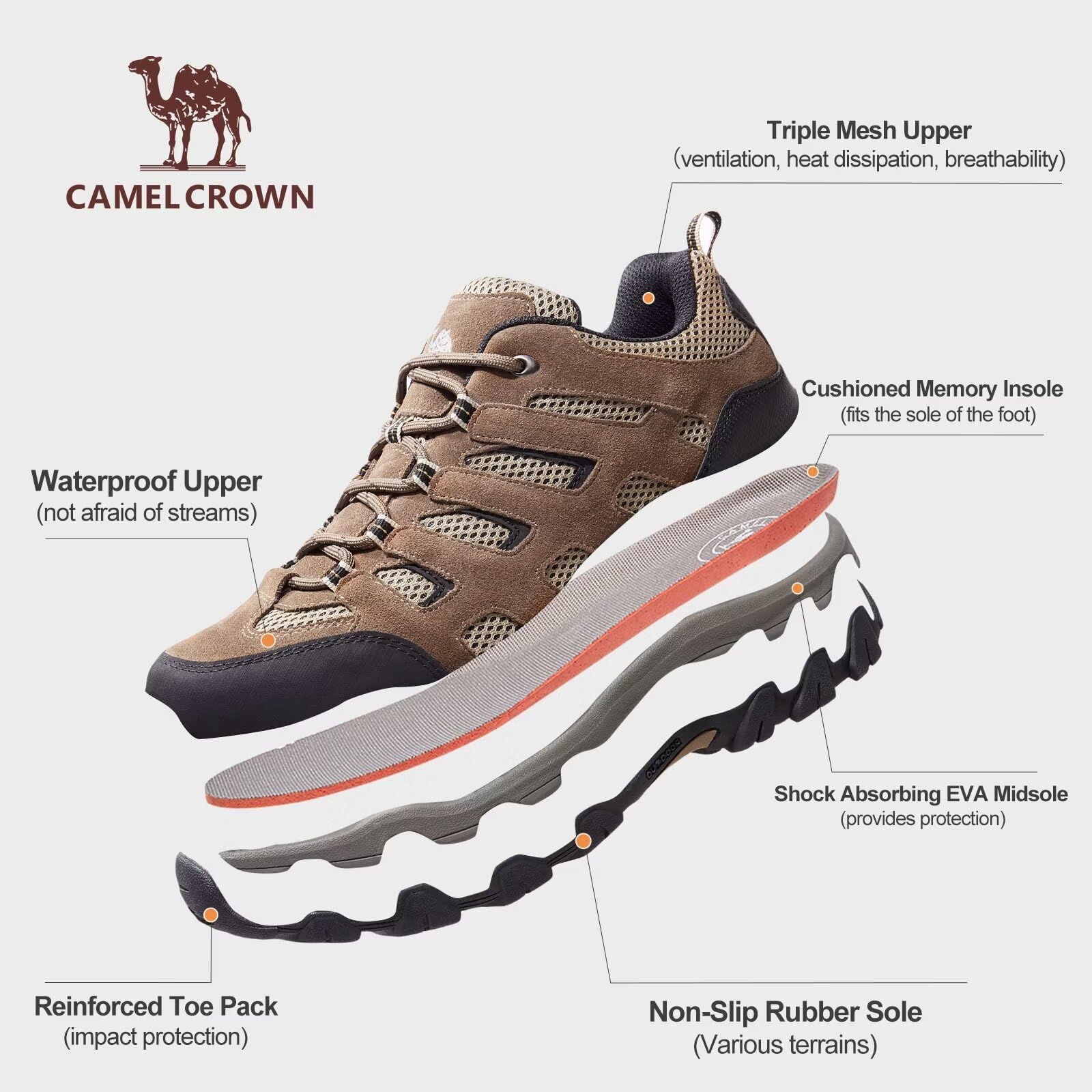 CAMEL CROWN Men's Waterproof Hiking Shoes for Outdoor Trailing Camping Trekking Low Top Lightweight Breathable Trail Shoes for Men Brown, Size 11