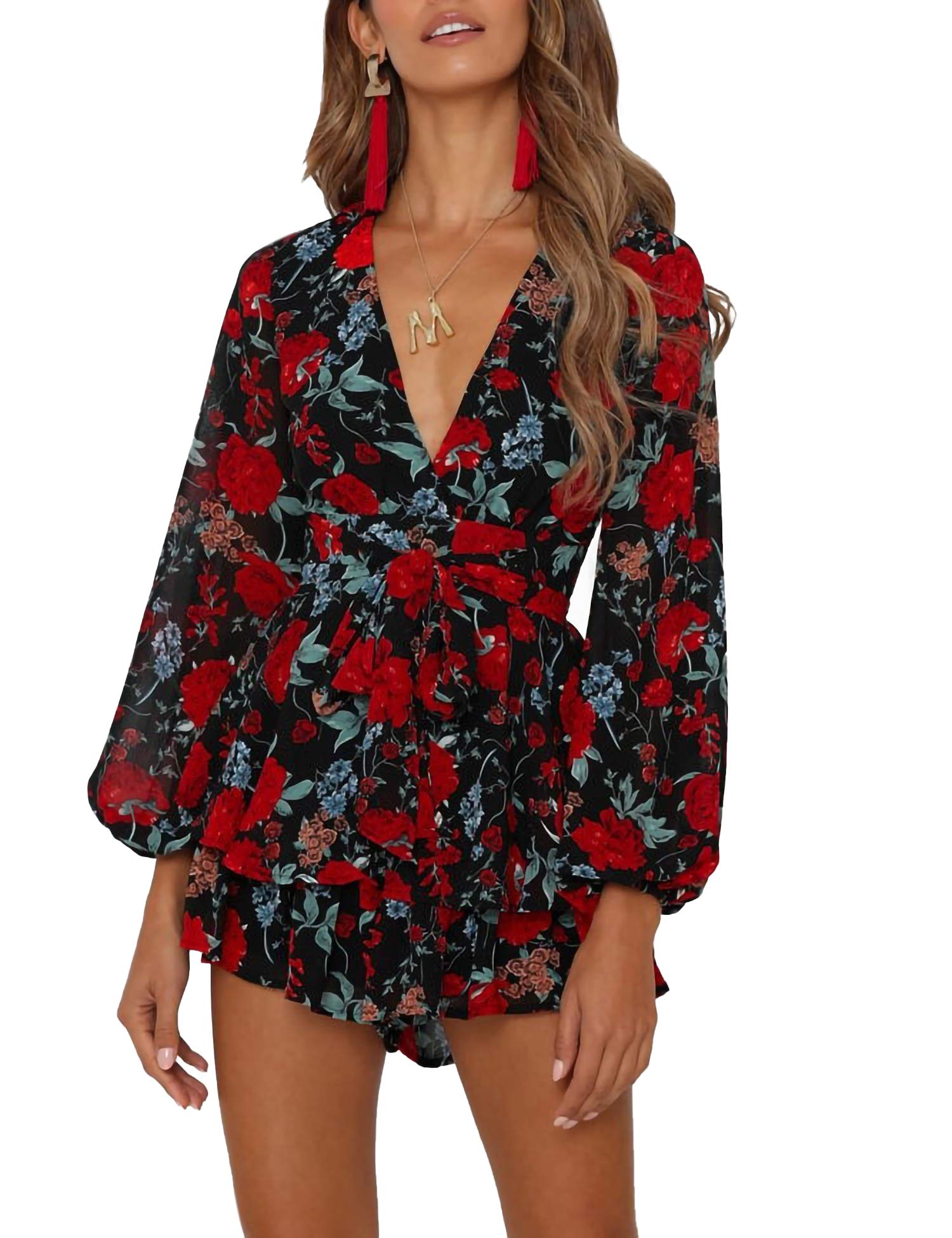 Details: Relipop Women's Romper Floral Print V Neck Baggy Sleeve Waist Tie Layered Ruffle Hem Short Casual Summer Rompers Jumpsuits