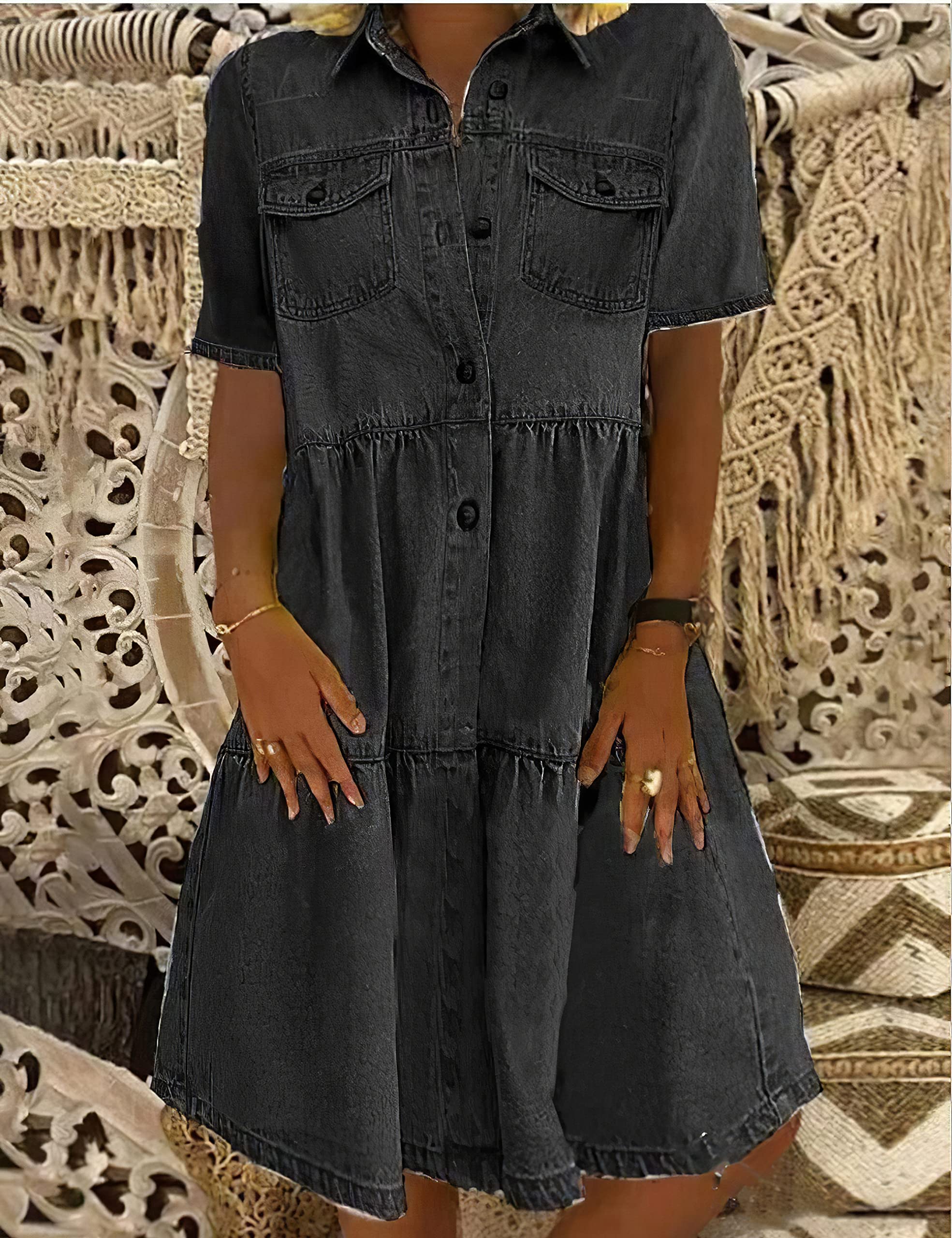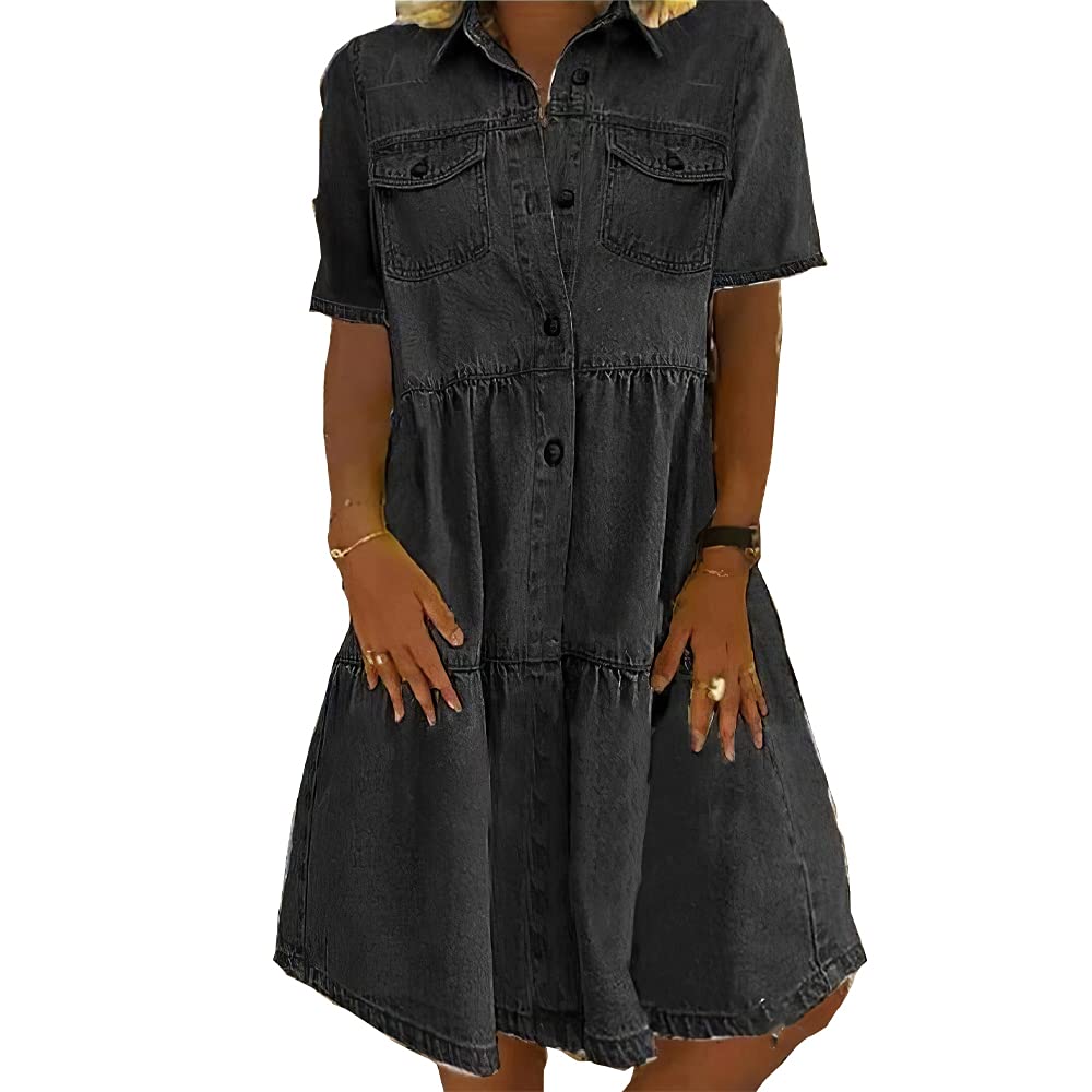 Akivide Women Denim Shirt Dresses Short Sleeve Distressed Jean Midi Dress Button Down Casual Tunic Top Multi-Pocket Black