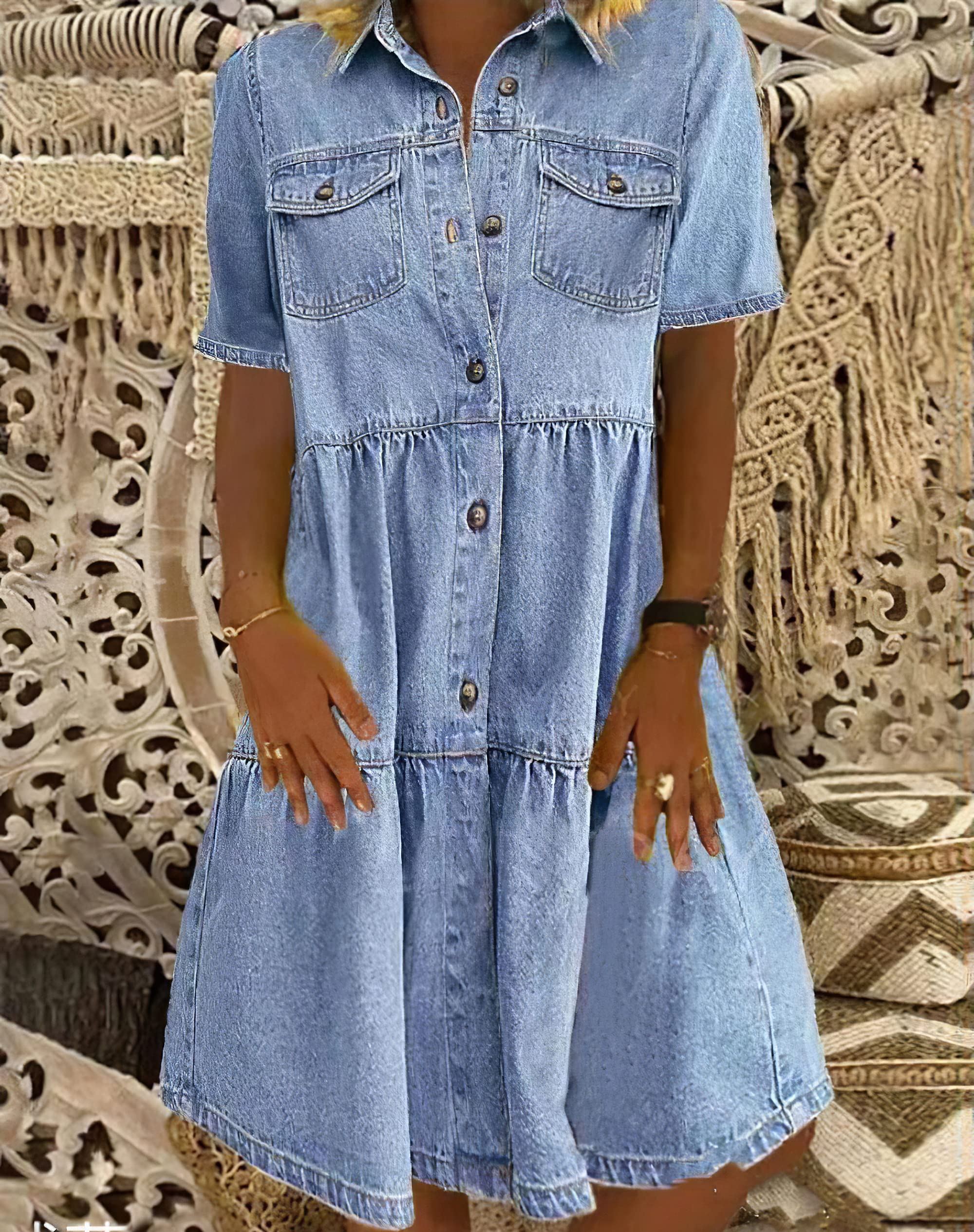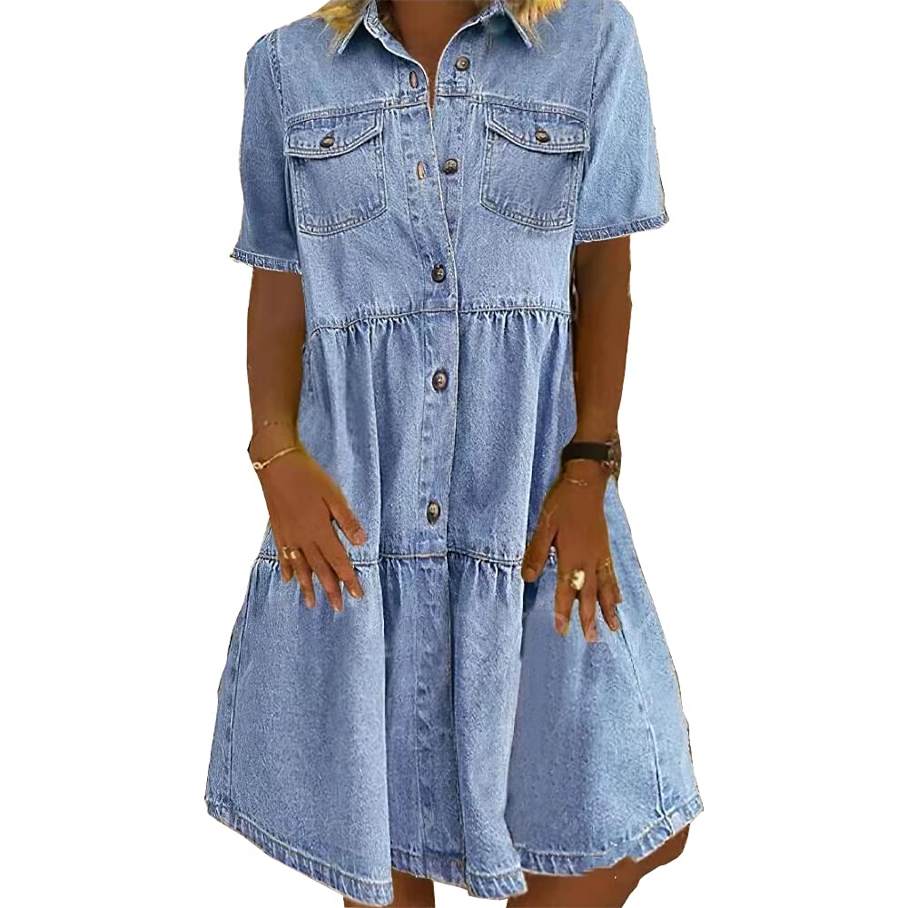 Akivide Women Denim Shirt Dresses Short Sleeve Distressed Jean Midi Dress Button Down Casual Tunic Top Multi-Pocket Sky Blue