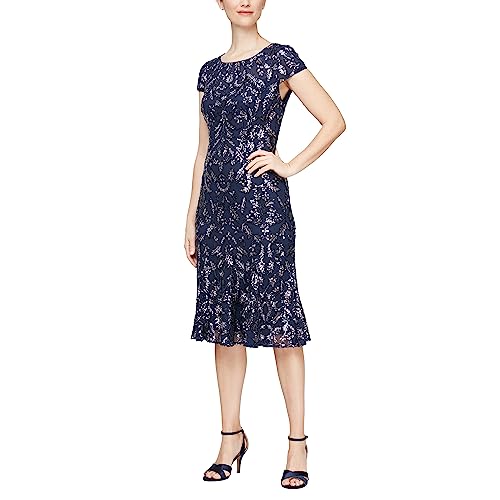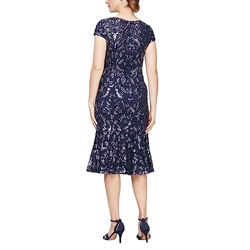 Alex Evenings Women's Tea Length Embroidered Dress with Godets, Navy and Pink