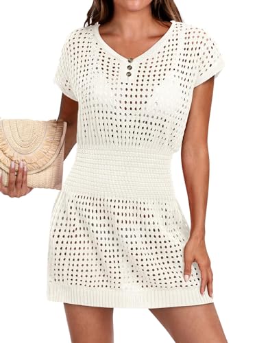 ANRABESS Women's Swim Coverups Crochet Hollow Out Summer Casual 2024 Fashion Outfits Short Sleeve V Neck Beach Swimsuit Bathing Suit Cover Up Swimwear Mini Tunic Dresses 1371chunbai-L White