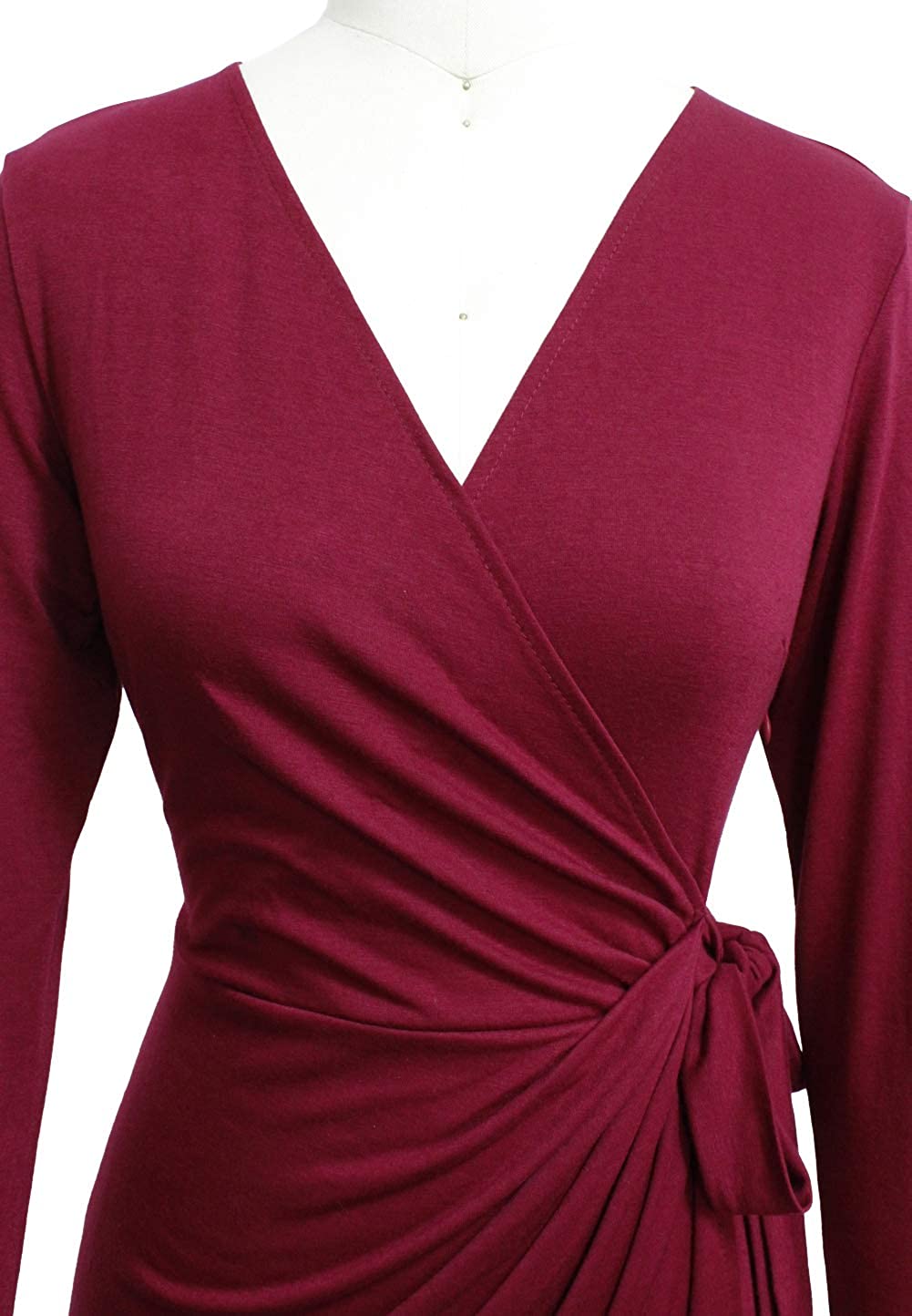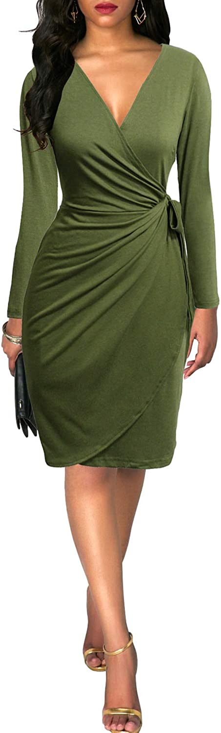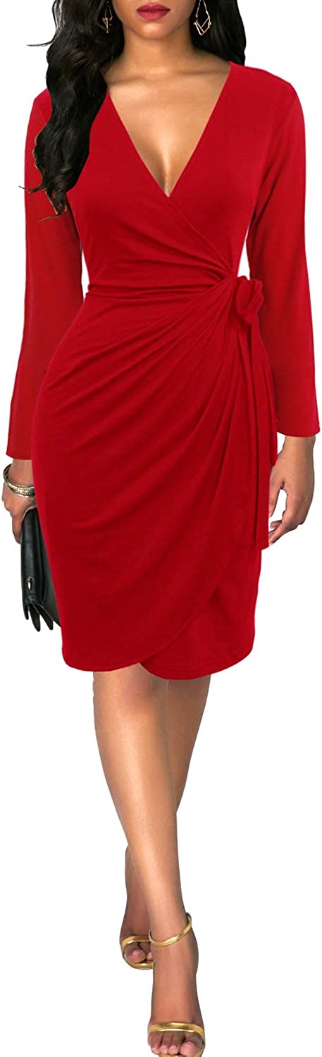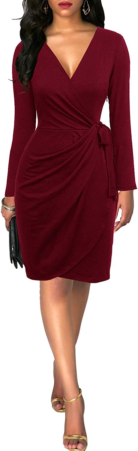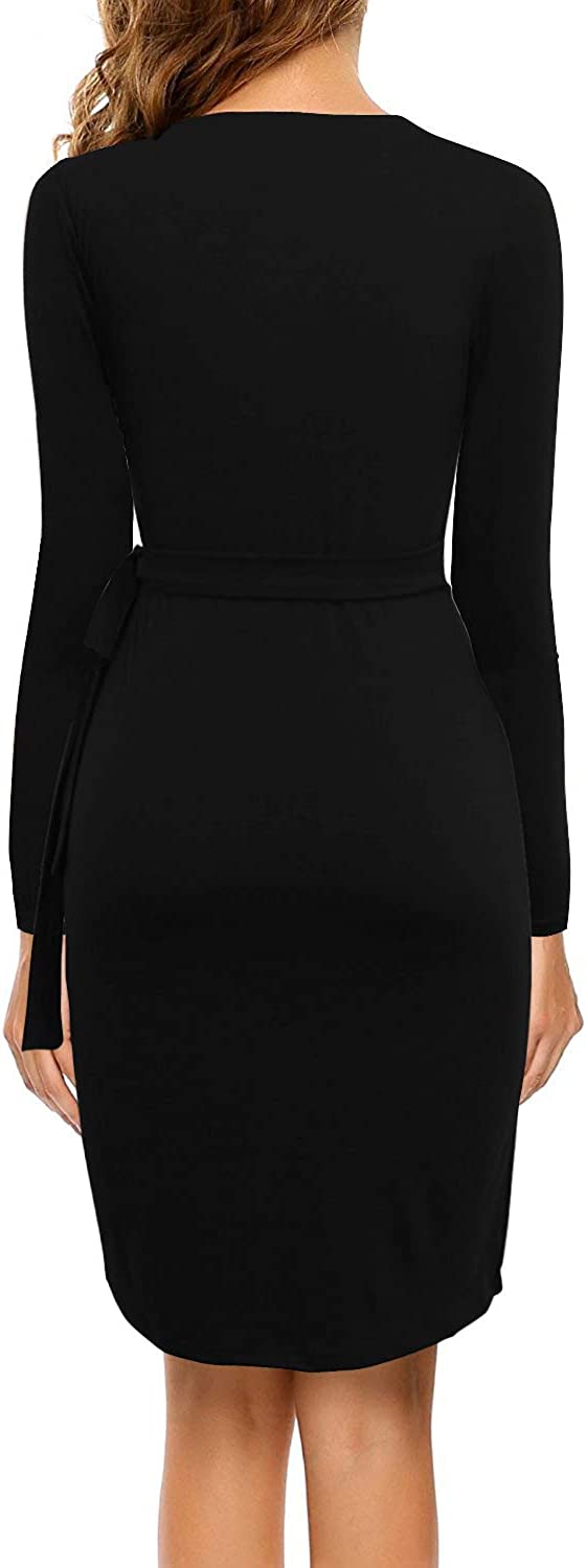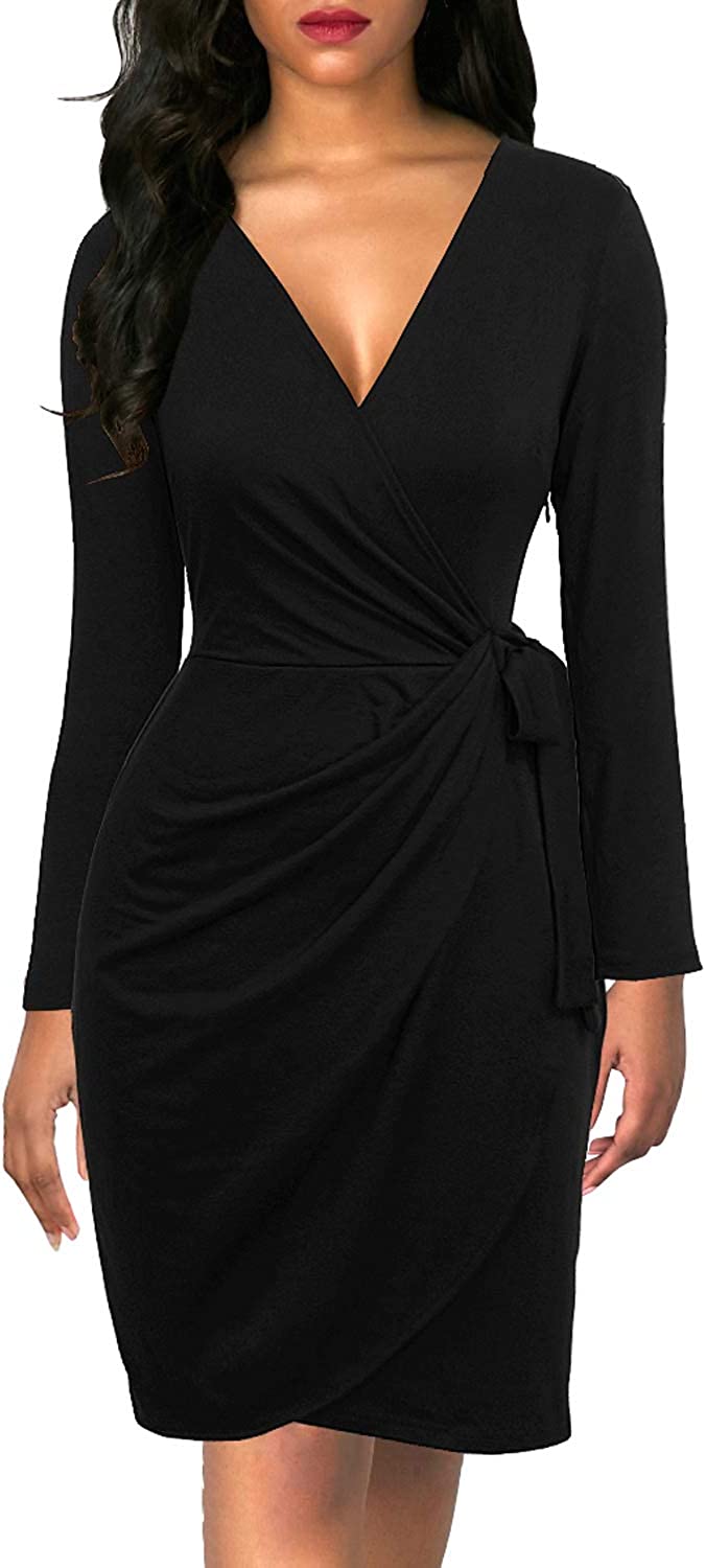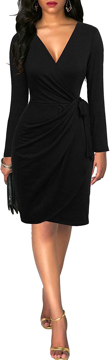 Berydress Women's Black Wrap Dress Sexy Deep V Neck Long Sleeve Knee-Length Cocktail Party Dresses