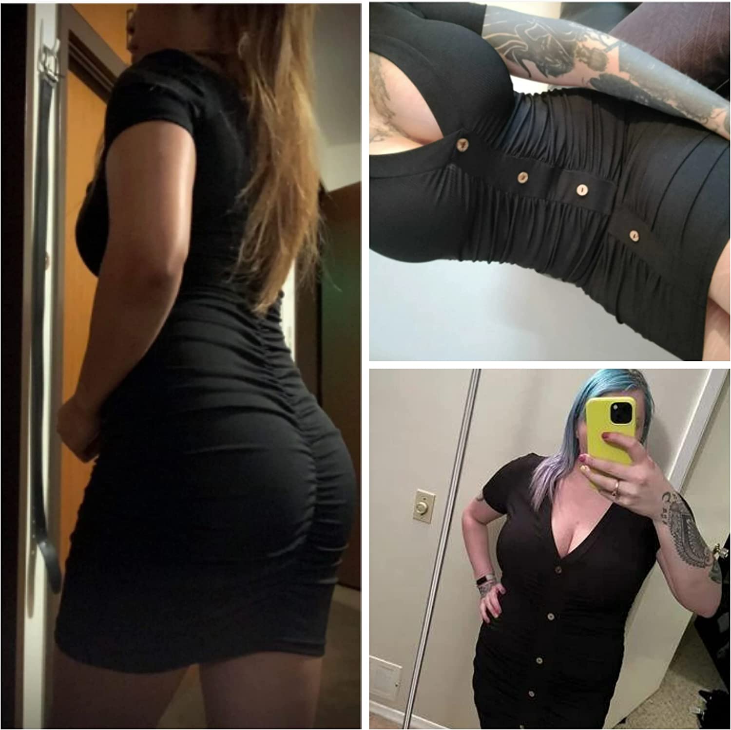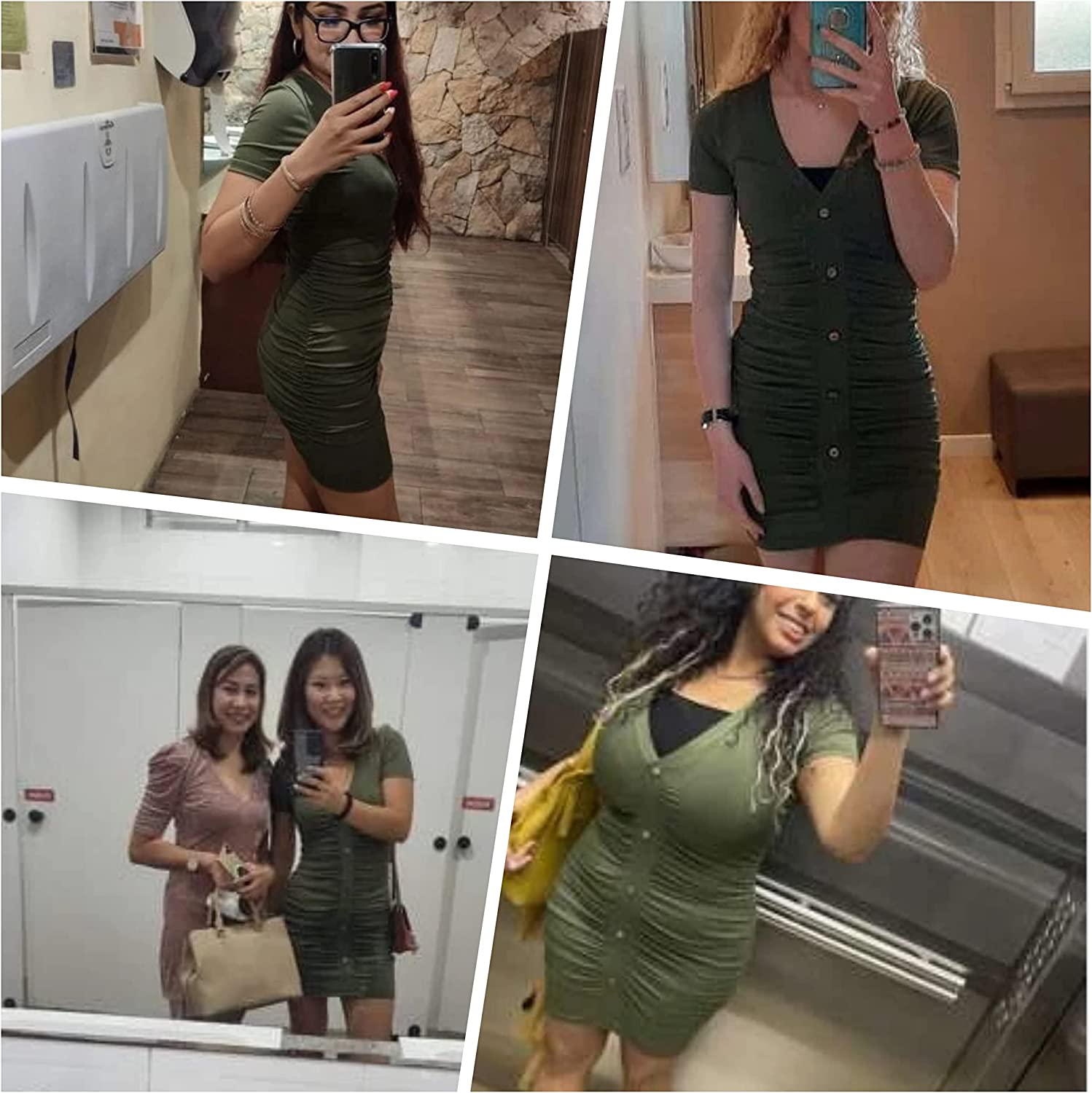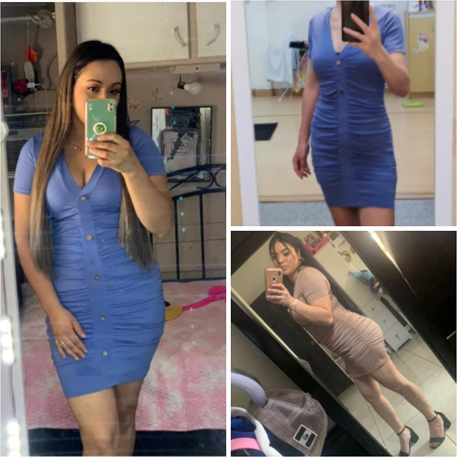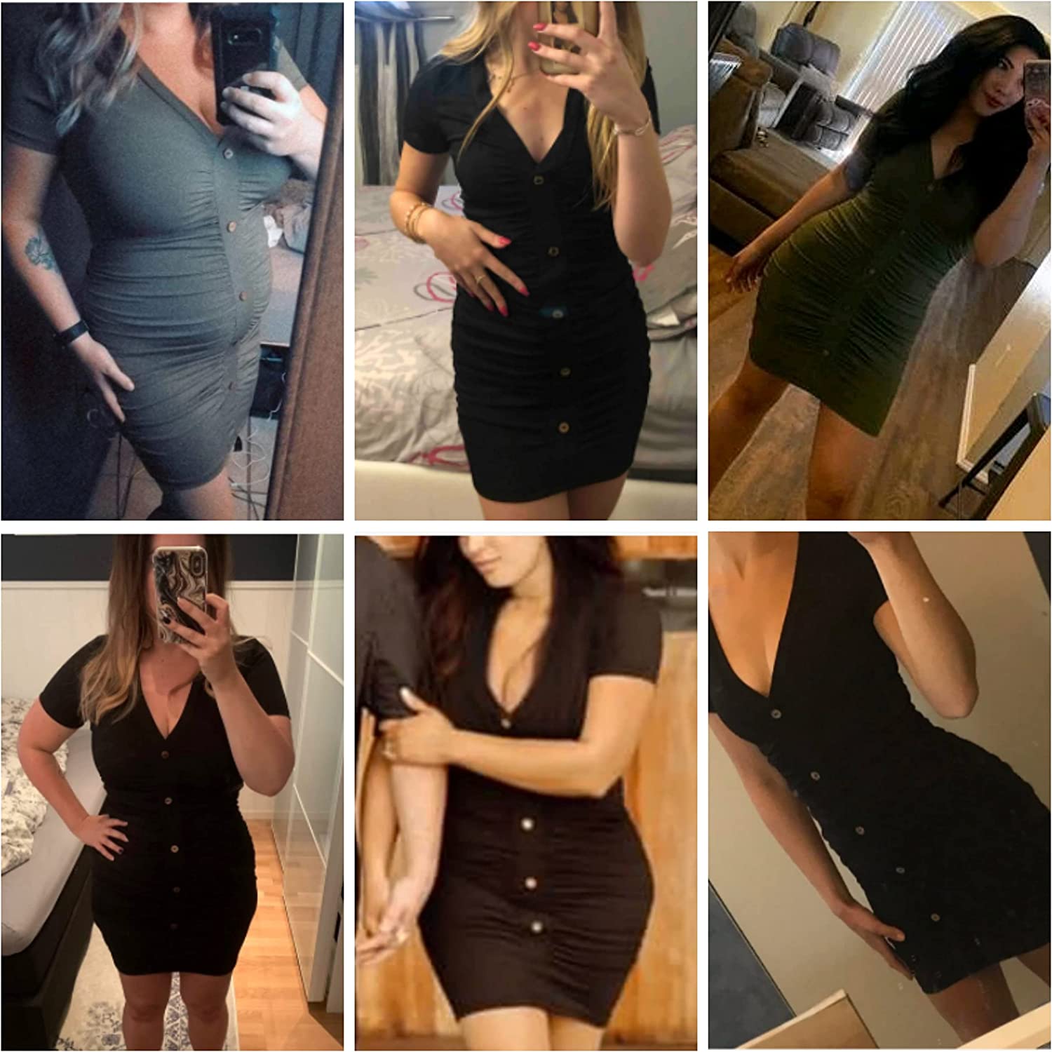 • 【FASHION DESIGN】Unique ruched scrunch details for curvy shape, accenting bust and hips. Sexy v neck low out, slim fit bodycon party club dress. Decorative button-down for a beautiful finish. Above knee/mid thigh length. Ruching both sides and back, freely adjustable in length, super great and easy to dress up and down.