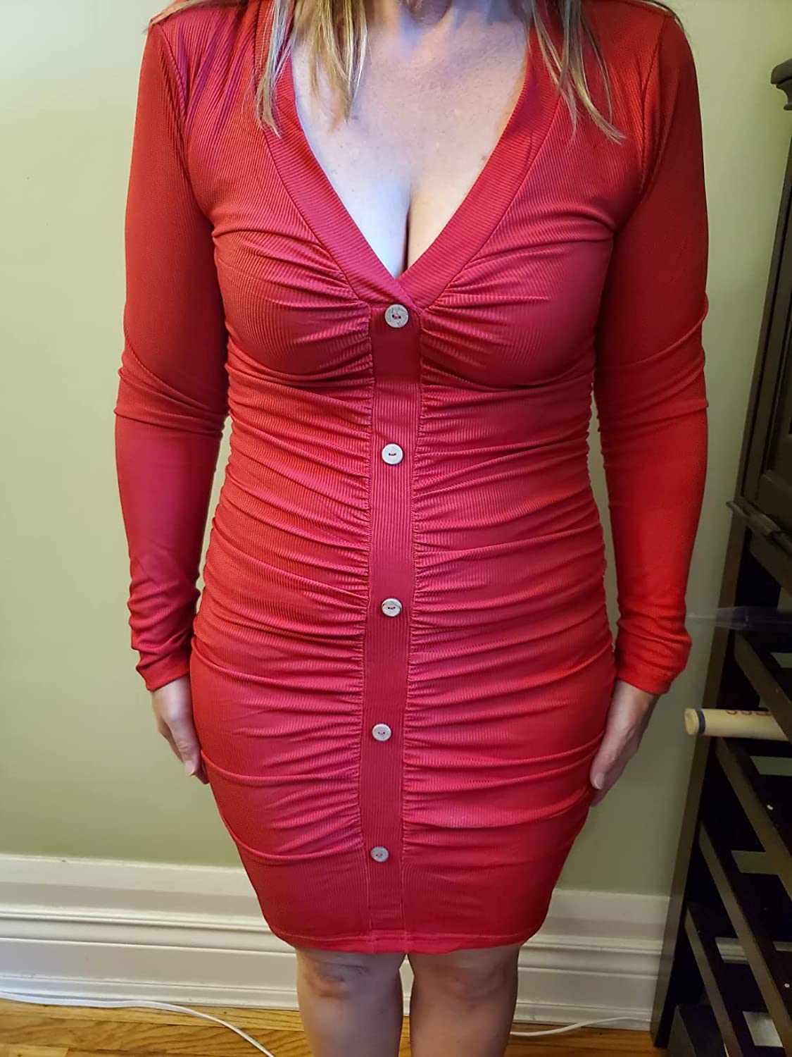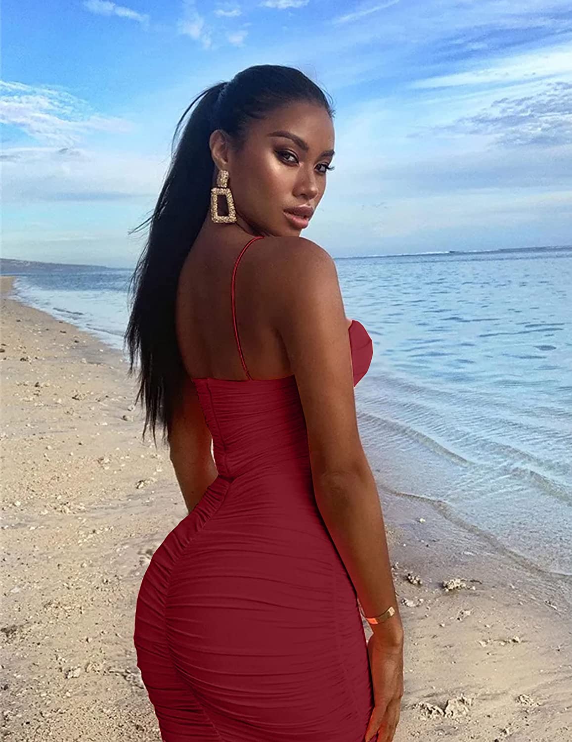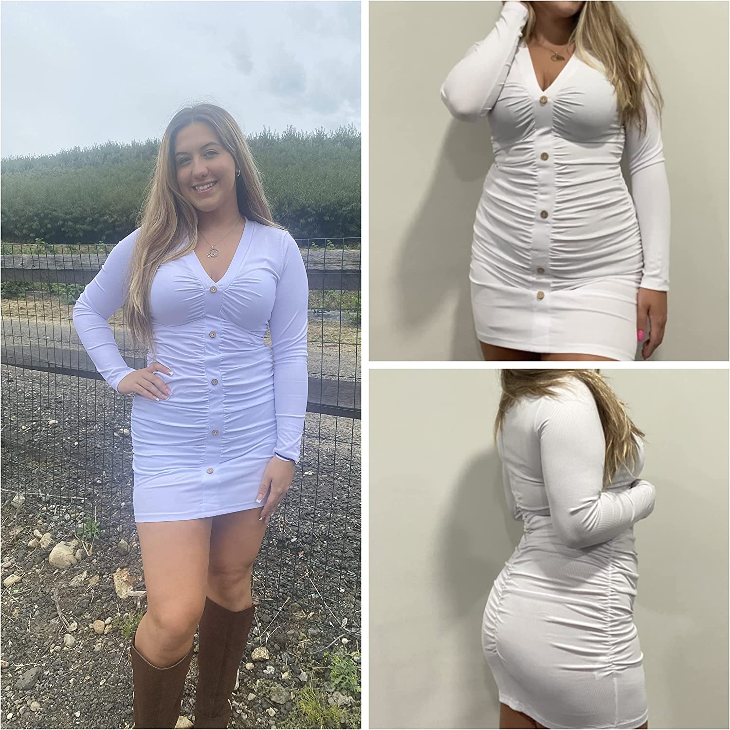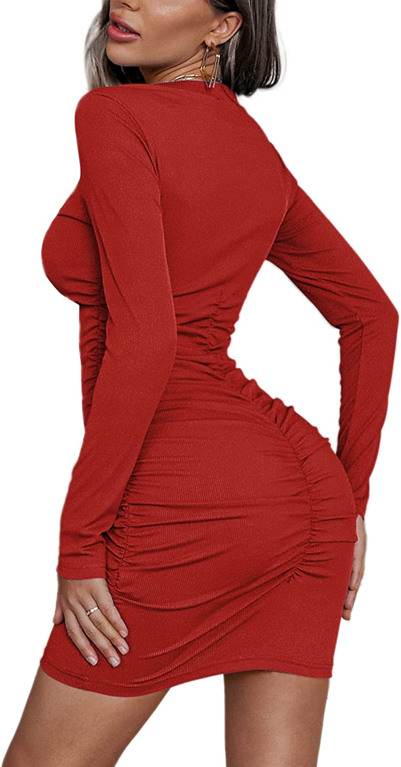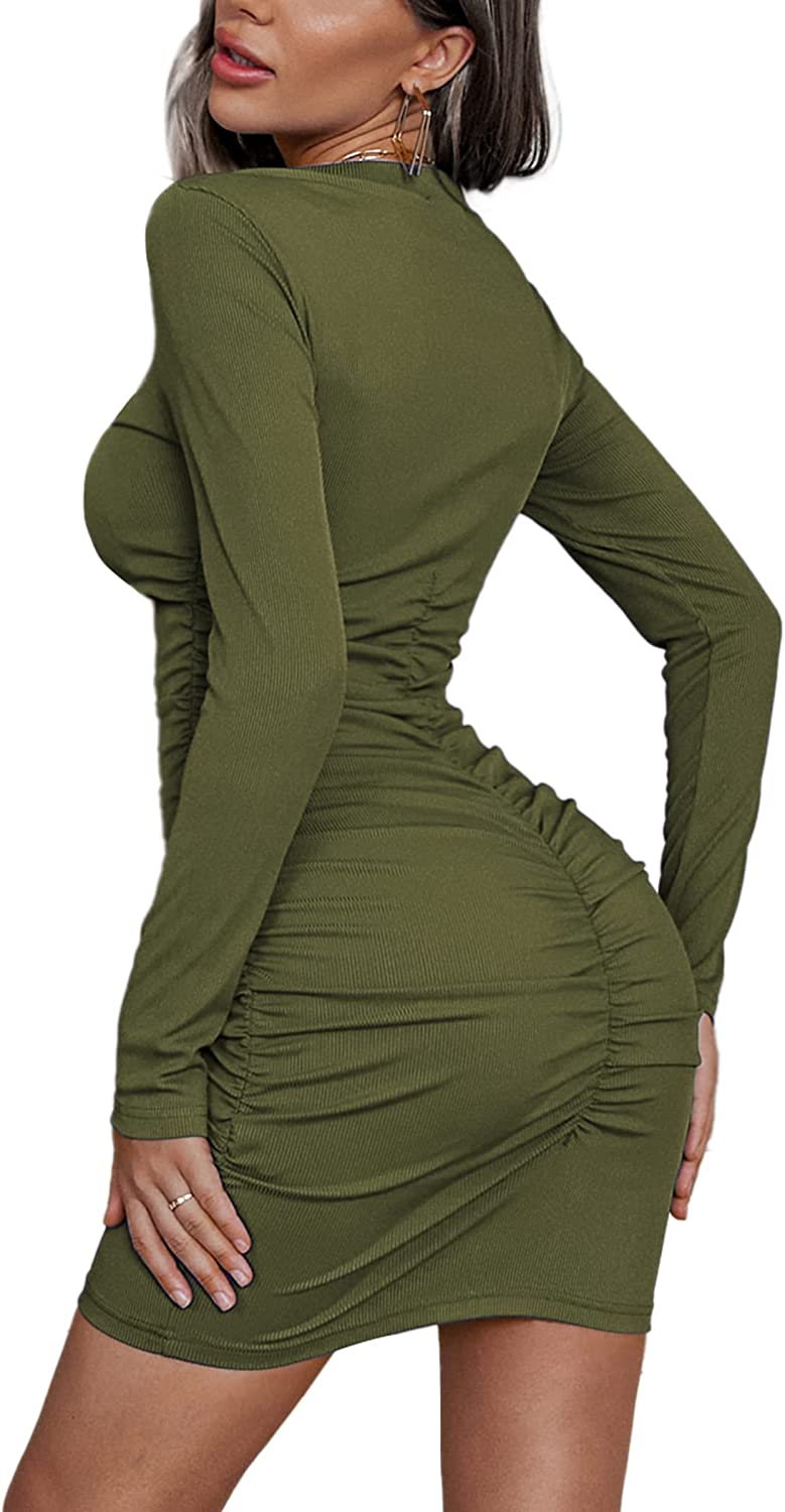 • 【FASHION DESIGN】Unique ruched scrunch details for curvy shape, accenting bust and hips. Sexy v neck low out, slim fit bodycon party club dress. Decorative button-down for a beautiful finish. Above knee/mid thigh length. Ruching both sides and back, freely adjustable in length, super great and easy to dress up and down.
